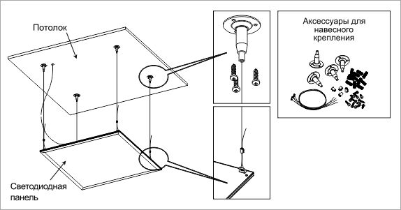Комплект для крепления светодиодных панелей на тросах (КПТ) позволяет подвешивать панели к потолку, регулировать необходимую высоту установки.