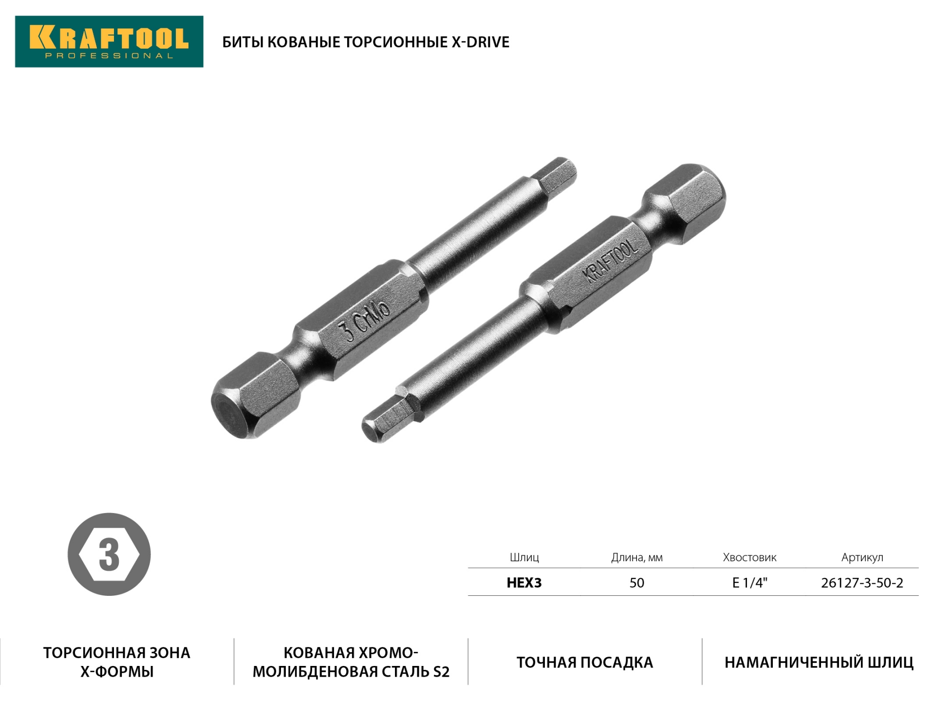 Бита (насадка) HEX3x50мм 2шт.KRAFTOOL