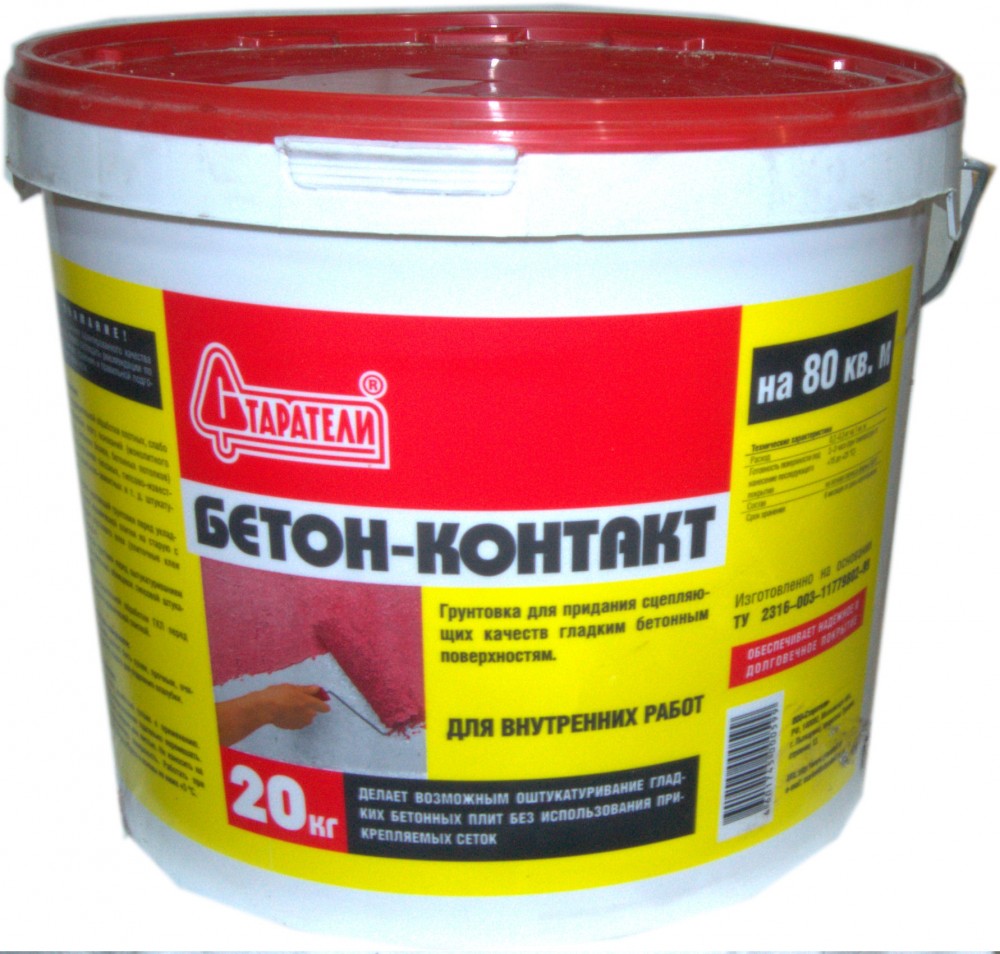 Теги: В качестве основы практически любых ремонтных работ обязательно выступает грунтовка, благодаря которой наносимые впоследствии отделочные слои будут надежно держаться на подготовленном основании, обеспечивая долговечность и целостность покрытий. В зависимости от материалов базовой поверхности используются различные виды (типы) грунтовочных составов. Особую сложность представляют основания из гладкого прочного не пористого бетона, монолита, блоков, отличающиеся слабовпитывающими свойствами. В этом случае рекомендуется применять бетон-контакт СТАРАТЕЛИ Бетоноконтакт (20 кг). Данная грунтовка специально предназначена для первичной обработки слабовпитывающих оснований, перед последующим нанесением штукатурки или облицовки керамической плиткой. Она обладает великолепными эксплуатационными характеристиками: Повышает адгезию основания к наносимым на него растворам, благодаря образованию шероховатой фактуры покрытия. Имеет специальный красноватый оттенок позволяющий контролировать качество нанесения грунтовки на поверхность, не пропускать необработанные участки. Дает возможность отштукатуривать гладкие поверхности без дополнительной подготовки (крепления специальной штукатурной сетки), тем самым минимизируя сроки проведения работ и уменьшая расход строительного материала. Позволяет облицовывать поверхность керамикой сразу на старую плитку (мозаику) без необходимости проведения демонтажа. Также после обработки грунтом покрытие из старой плитки можно отштукатуривать. В зависимости от индивидуальных объемов обрабатываемой площади бетон-контакт СТАРАТЕЛИ Бетоноконтакт (20 кг) наносится на поверхность ручным способом (валик, кисть, щетка) или механическим (краскопультом). Последний вариант наиболее актуален при подготовке оснований больших размеров, на масштабных строительных объектах. Банка грунта 20 кг. рассчитана в среднем на 80 м2.