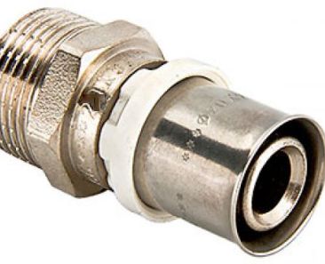 Двухсторонний прямой пресс-фитинг для соединения металлополимерной трубы или трубы из сшитого полиэтилена и компонента системы с резьбовым подключением. Резьба фитинга – наружная трубная по ГОСТу 6357.